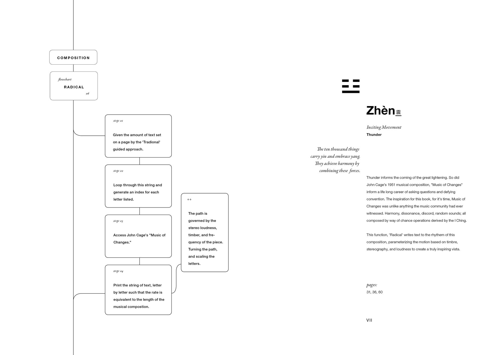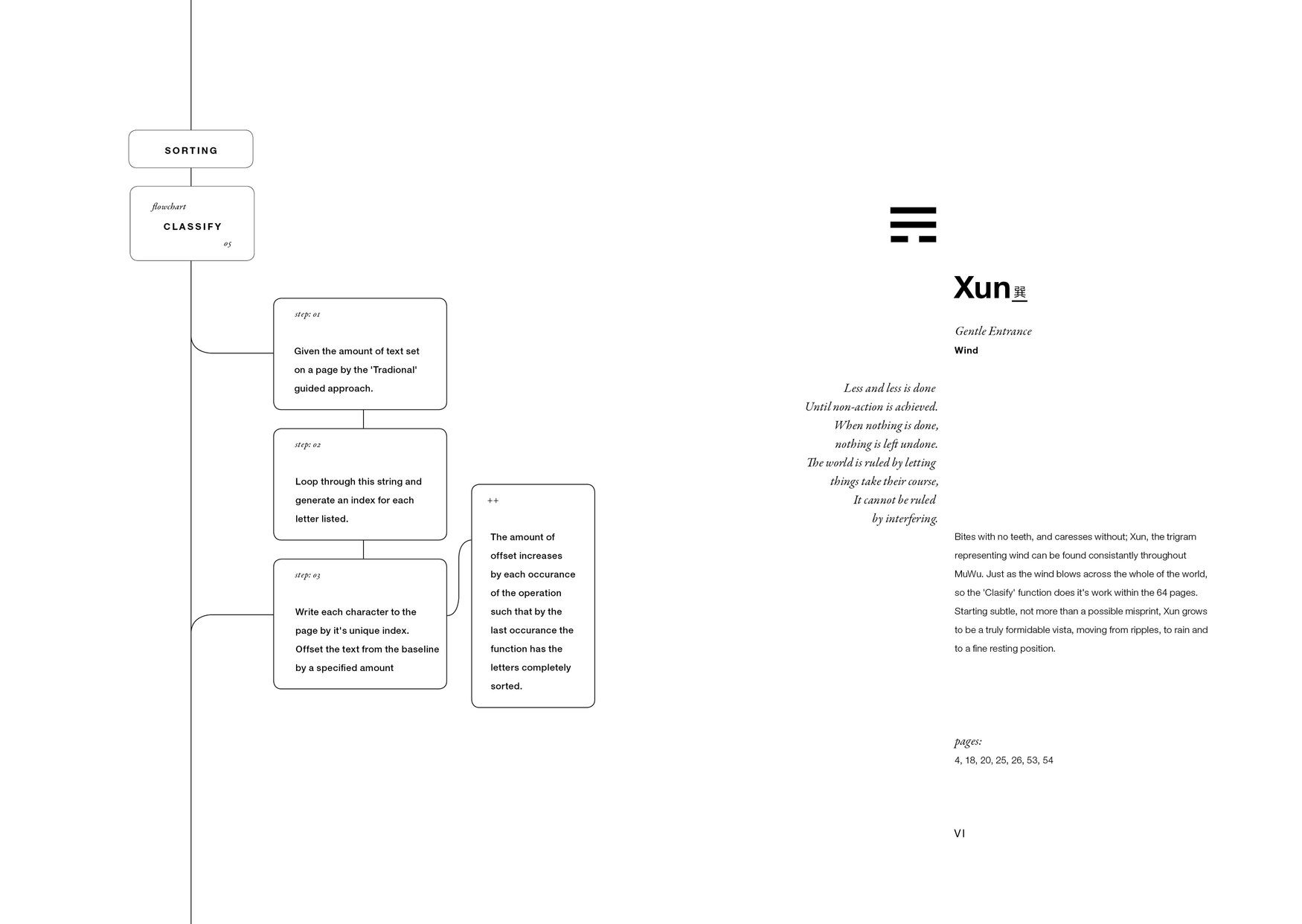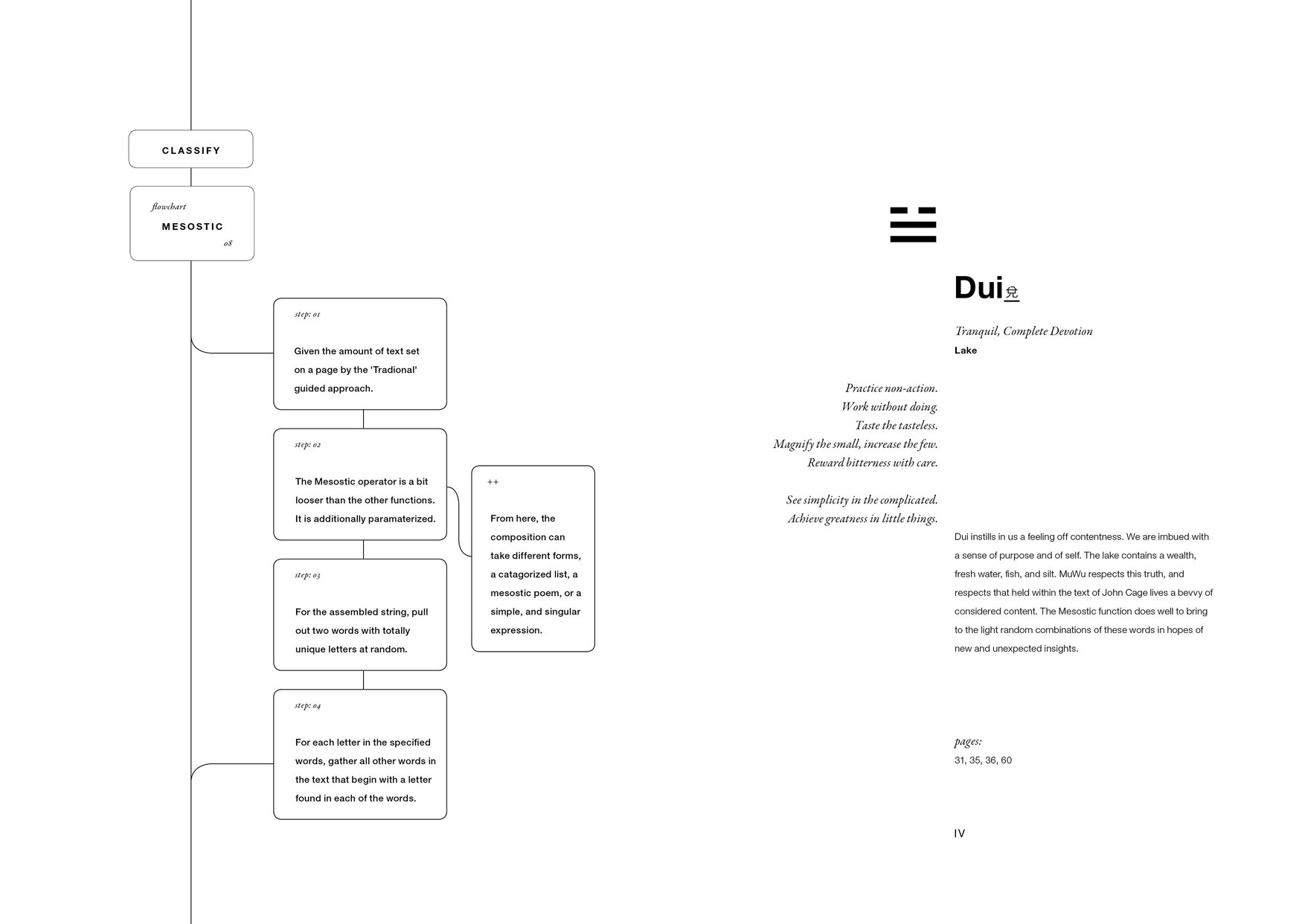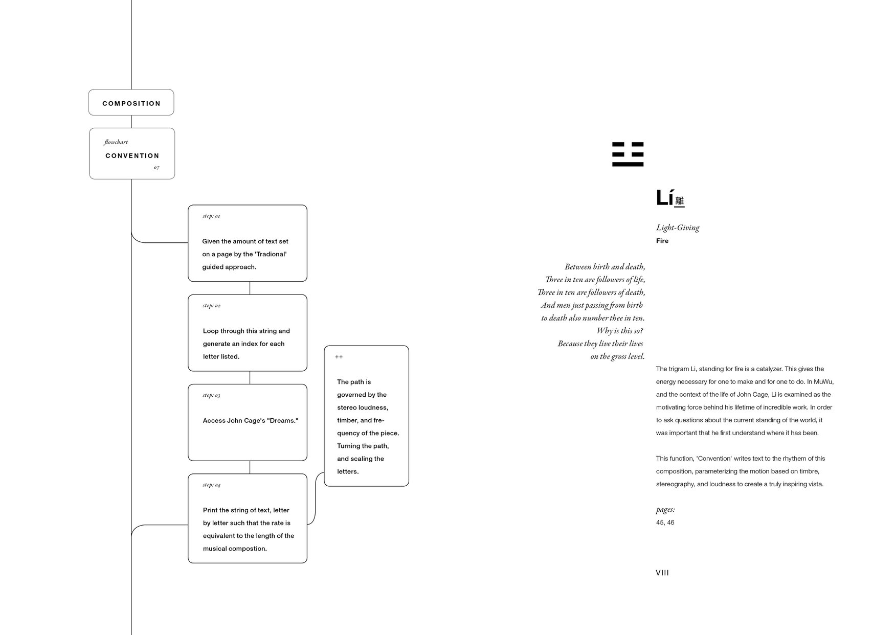 MuWu is a collection of the thoughts and the experience of John Cage. Inspired by the classic text, I Ching, MuWu is intended to ask questions. How is a book composed? What is language and how does it flow? After a single trip to China, John Cage was converted to a Taoist believer. He incorporated chance operations, found in the I Ching, into most of his artworks for the rest of his life. Letting go of intention and embracing the natural flow of tao led Cage to create some of the 20th century's most influential artworks. MuWu pays homaged to to late John Cage by continuing where he left off. The book uses a computational approach to to story telling to fill up exactly 64 body pages with unique content from the compilation, Conversing with Cage. The length was chosen in response to the 64 hexagrams of the I Ching. MuWu attempts to assemble completely new and unique thoughts from the any dialogues found in Conversing with Cage. This approach shifts creative control from the designer towards the algorithm.